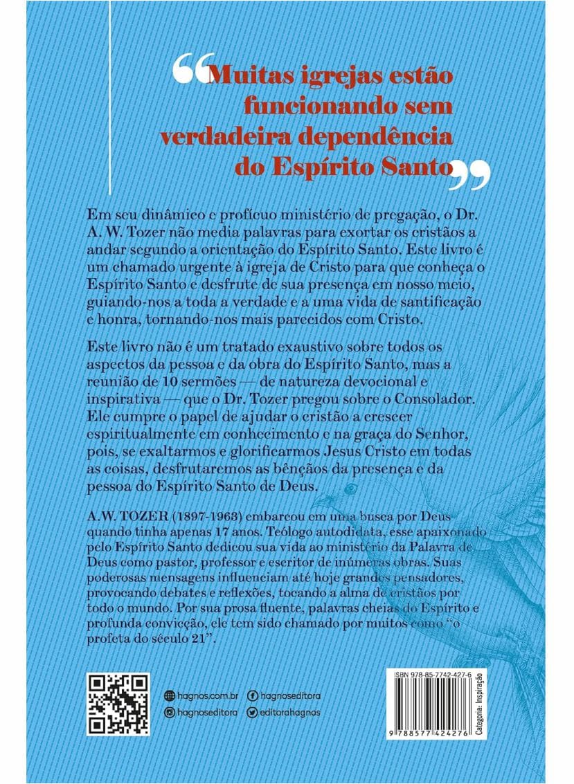 Em seu dinâmico e profícuo ministério de pregação, o Dr. A. W. Tozer não media palavras para exortar os cristãos a andar segundo a orientação do Espírito Santo. Este livro é um chamado urgente à igreja de Cristo para que conheça o Espírito Santo e desfrute de sua presença em nosso meio, guiando-nos a toda a verdade e a uma vida de santificação e honra, tornando-nos mais parecidos com Cristo.