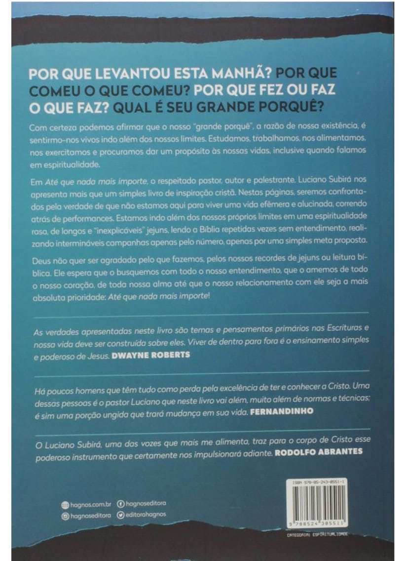 Um dos expoentes do meio cristão neopentecostal, o pastor e palestrante Luciano Subirá lança, este mês, pela Editora Hagnos, seu novo livro Até que nada mais importe. A obra chega às livrarias a partir deste mês e trata de assunto pertinente aos dias de hoje: o relacionamento pessoal com Deus. A pauta, em tese, presente em praticamente todas as liturgias cristã, nasceu no coração do pastor após reflexão pessoal a respeito do que, de fato, Deus espera de cada um de nós. “Nossa busca por Deus ainda e muito, muito fraca”, aponta ele. O objetivo de Até que nada mais importe é justamente levar o leitor a repensar sobre o verdadeiro foco de sua existência: “Devemos chegar a um ponto tal nesse anseio por Deus, que nada mais importe”. Frases destaque: “Há muitos cristãos se esforçando por ‘merecer’ o amor de Deus. Mas o amor divino não tem nada a ver com perfomance